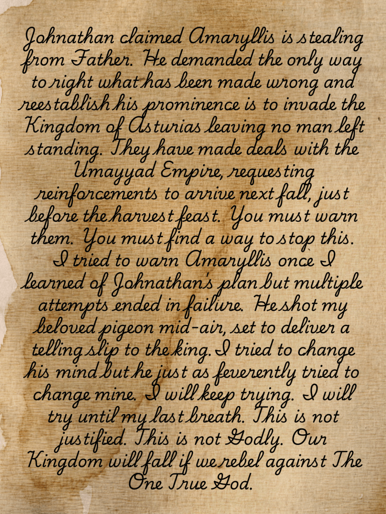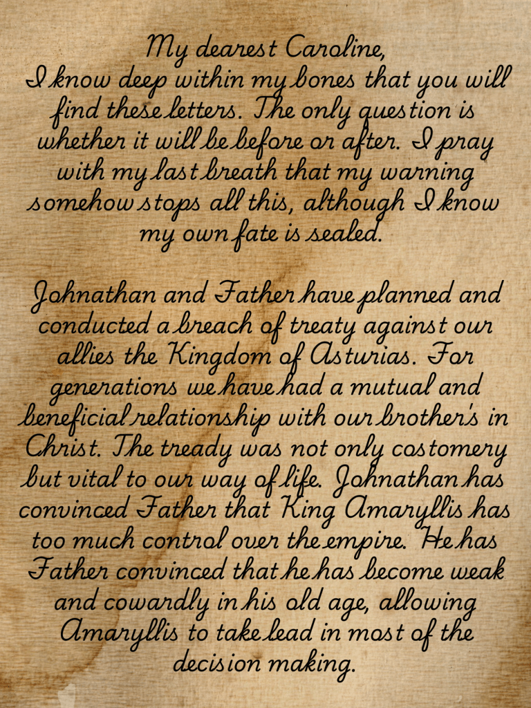 Caroline stared at the note in disbelief. How could this possibly be true? But how could she ignore the obvious warnings? Her heart sanks lower as she scanned the rest of the letters that solidified what she feared. Each one described in detail the strategies of Johnathan and Damion’s plan to conquer the Kingdom of Asturias, each one sealed with her father’s royal signet.
