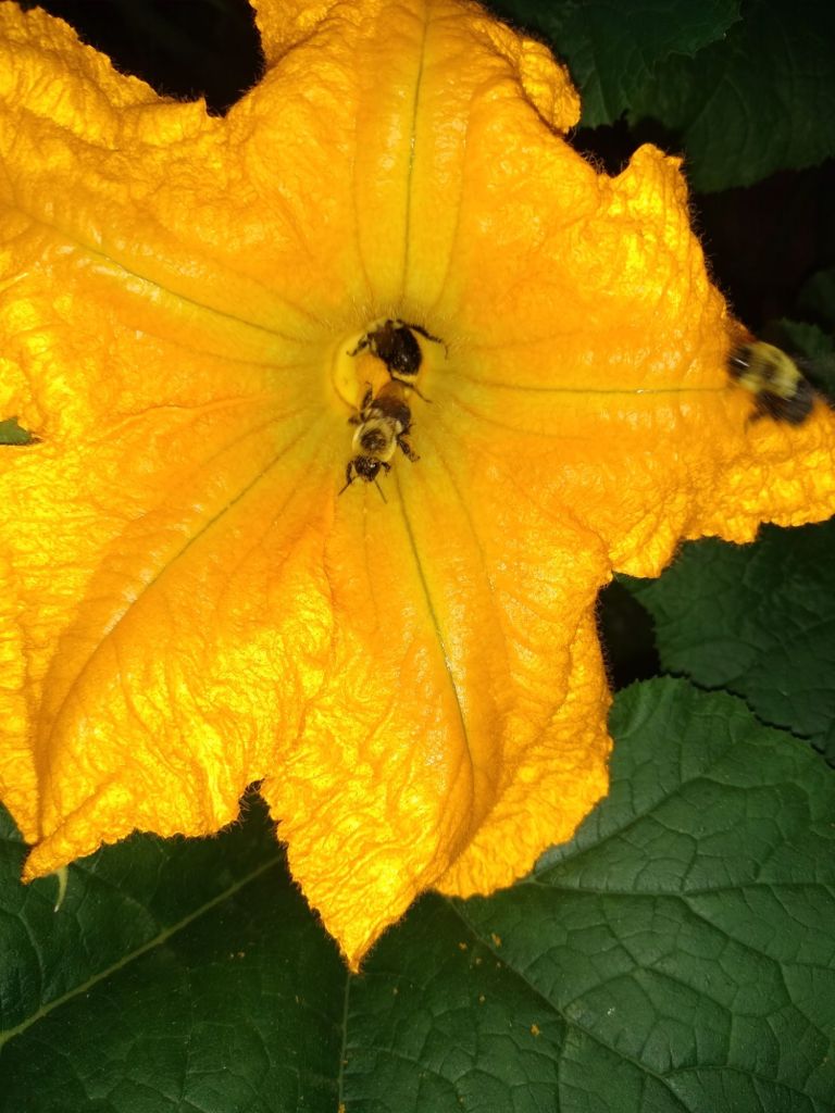 A few years ago I grew a pumpkin vine and was thrilled to see that the bumblebees really enjoyed the giant flowers. I would visit the plant daily to see them and enjoyed watching them eat their buffet. I love bees, especially bumblebees and have even held a few in my lifetime. Below is a video I captured.