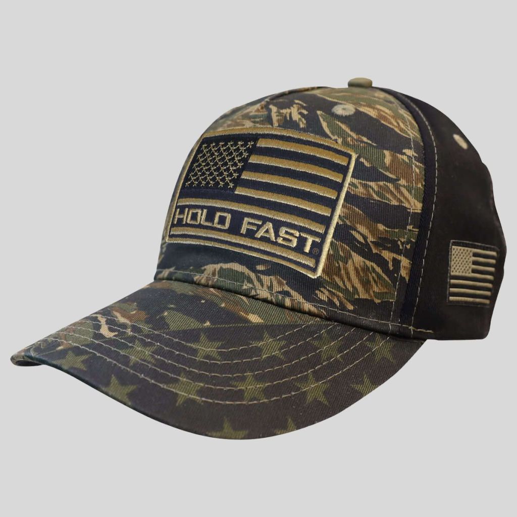 Share your faith in America with this bold take on camouflage. Our “Tiger Stripe Camo” Cap by HOLD FAST® offers a rugged blend of patriotism and jungle style. The flag of the United States of America is worthy of celebration! We can stand up for our flag because of the sacrifice of those who serve in the United States Armed Forces, and ultimately because of the sacrifice of our Lord and Savior, Jesus Christ, on the cross at Calvary. When you pledge allegiance to the flag or see those colors flying in the breeze, think on these things.