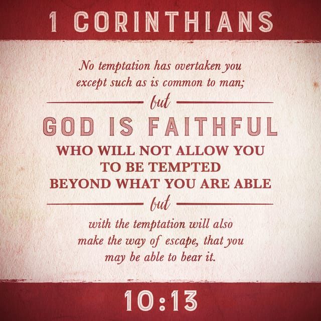 13 There hath no temptation taken you but such as is common to man: but God is faithful, who will not suffer you to be tempted above that ye are able; but will with the temptation also make a way to escape, that ye may be able to bear it.